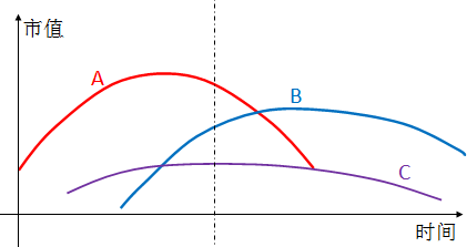 图中,虚线为此时你所站的位置,A、B、C三个细分行业的走势已经清楚,该如何选择一目了然。